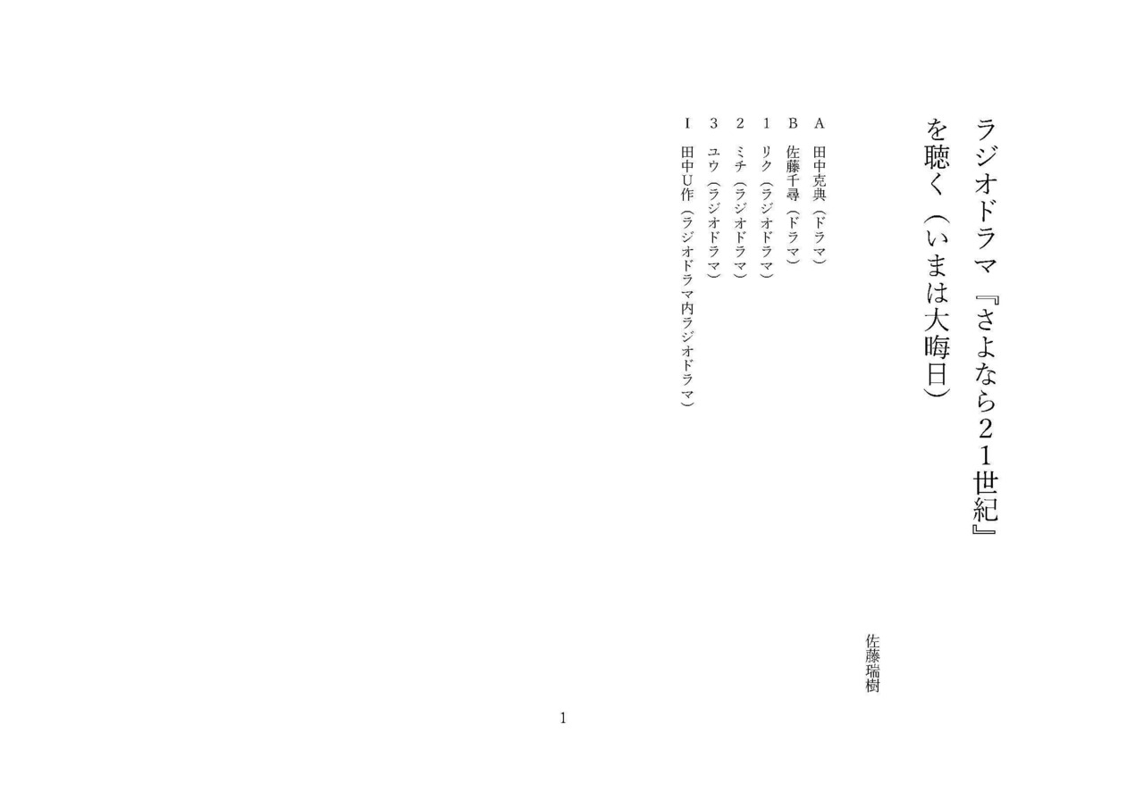 「ラジオドラマ『さよなら21世紀』を聴く(いまは大晦日)」の脚本データです。 ※商品画像一枚目のメインビジュアルは、PDFに含まれません。